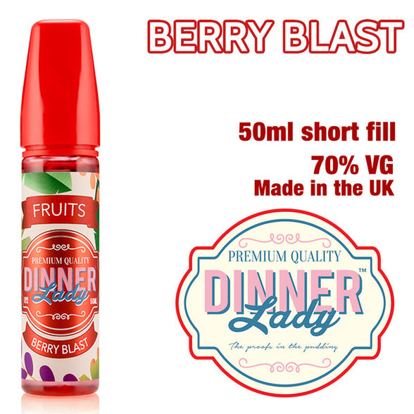 Berry Blast - by Dinner Lady. 50ml of zero nicotine e-liquid in a 60ml bottle. 70% VG / 30% PG and flavourings. Award-winning premium flavour e-liquids made in the UK.